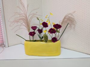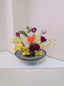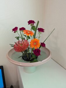連休明けで午前中はバタバタで昼から生けました。赤い小花は葉からしたらトルコ桔梗と思います。初めての色です。とりとめのない生け方になりました。