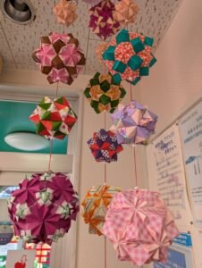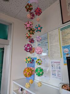 2026/02/20 患者さんから頂いた紙製のくすだまを使ってさげもん風に作って貰いました。色や形が色々のくす玉なので下げると素敵です。玄関を入って左手に飾っていますので来院時には見ていただければ幸いです。写真は全体像と拡大像です。