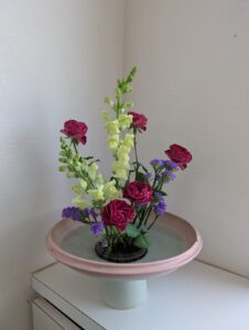 今週はバラと金魚草、ガーベラを使って生けました。なかなかバランスが難しかったです。春らしい感じになっていると良いですが。