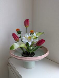 今週は赤い大きなチューリップをメインに紅花をポイントに生けました。バランスが難しかったです。